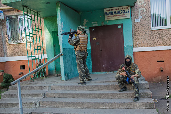 Бойцы народного ополчения Донбасса во дворе жилого дома Краматорска.