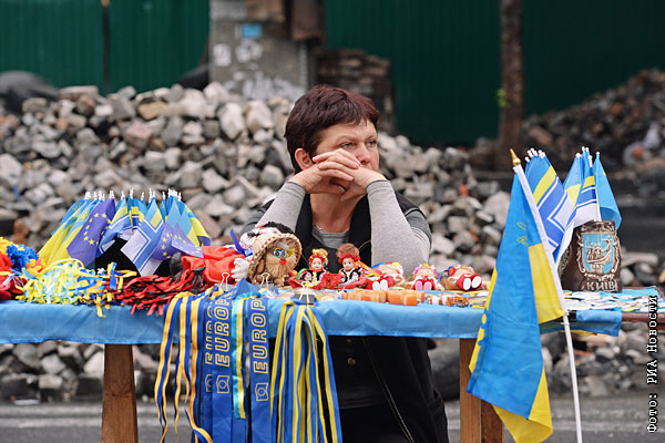 Продавец сувениров у баррикад, оставшихся на одной из улице Киева.