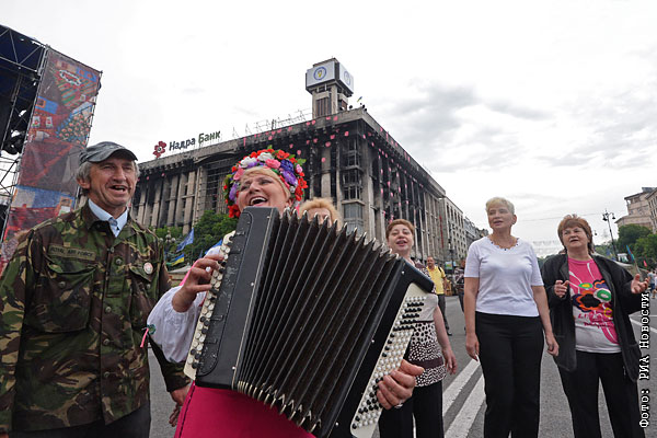 Местные жители поют песни на площади Независимости в Киеве накануне выборов.
