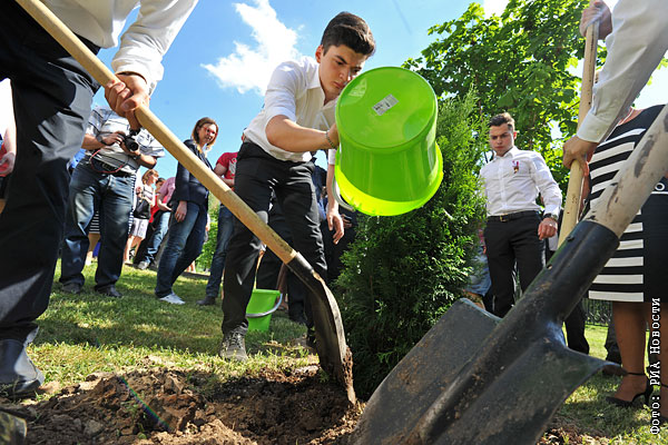 Школьники московской средней школы № 2098 имени Л.Доватора сажают деревья на аллее выпускников в день Последнего звонка.
