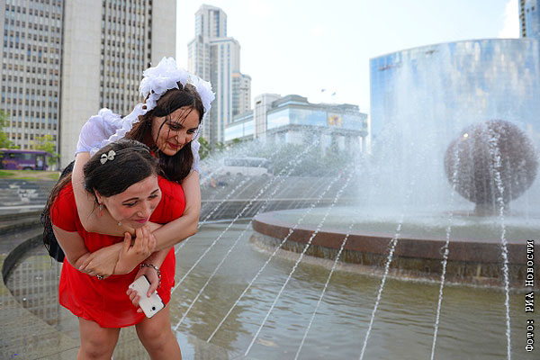 Выпускницы гуляют в день Последнего звонка на Октябрьской площади в Екатеринбурге.