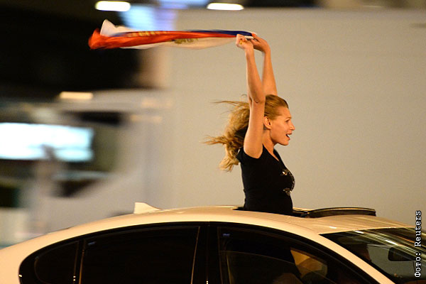 Болельщики празднуют победу сборной России по хоккею