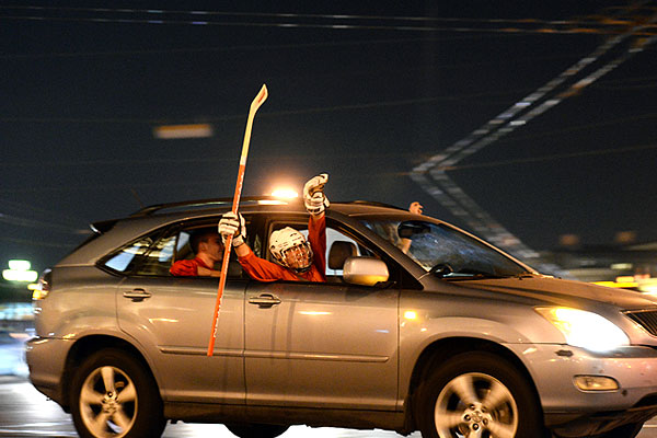 Болельщики празднуют победу сборной России по хоккею