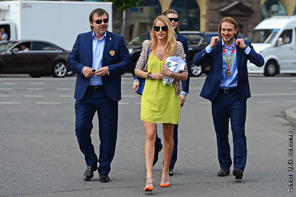 Главный тренер сборной России по хоккею Олег Знарок с дочерью Алисой, игроки национальной сборной России по хоккею Виктор Тихонов и Андрей Зубарев (слева направо) во время торжественных мероприятий по случаю победы сборной России на чемпионате мира по хоккею.
