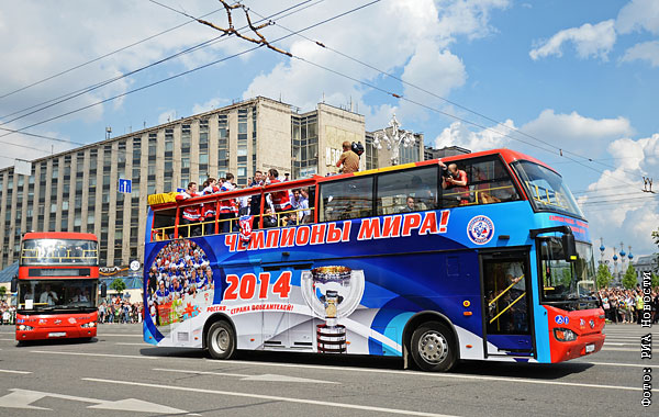 Автобус с игроками национальной сборной России по хоккею во время торжественных мероприятий по случаю победы сборной России на чемпионате мира по хоккею.