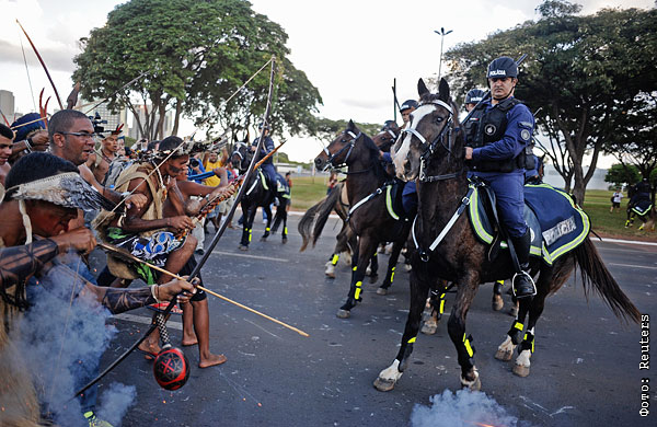 Противники мундиаля, бразильские индейцы пытаются прорваться к стадиону, где должен был состоятся показ Кубка мира.