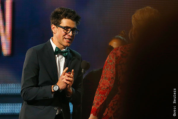 Виталий Седюк на сцене в тот момент, когда пытается получить Grammy вместо исполнительницы Адель.
