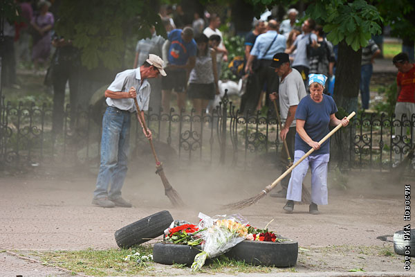 Жители убирают территорию вокруг здания областной администрации Луганска после авиаатаки 2 июня.