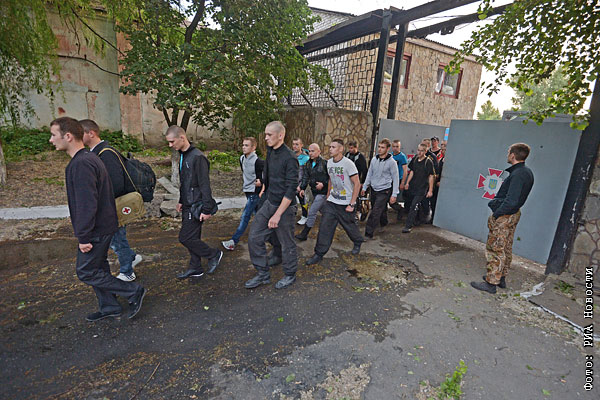 Солдаты внутренних войск покидают военную часть в Луганске, взятую под контроль ополченцами после ночного боя.