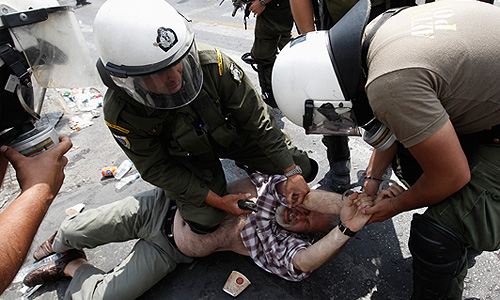 Полицейские задерживают участника 48-часовой забастовки, организованной крупнейшими профсоюзами государственных служащих и работников частного сектора в знак протеста против многомиллиардных сокращений расходов.