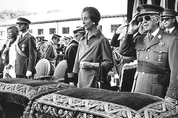 На переднем плане - генерал Франциско Франко с женой Кармен Поло, слева в кадре - Хуан Карлос с женой Софией во время исполнения национального гимна Испании.