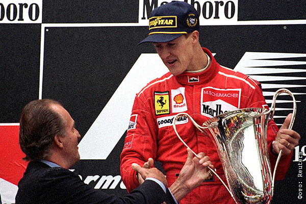 Король Хуан Карлос вручает кубок гонщику "Формулы 1" Михаэлю Шумахеру.