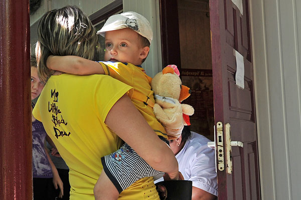 Женщина с ребенком у входа в медицинский кабинет оздоровительного центра "Дмитриадовский" в Ростовской области.