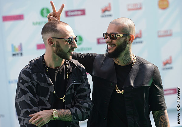 Певец Тимати (справа) и певец L'ONE перед церемонией вручения XII премии в области популярной музыки "Муз-ТВ-2014. Эволюция" в спорткомплексе "Олимпийский" в Москве.