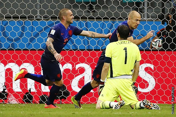 Футболисты сборной Голландии Уэсли Снейдер (слева) и Арьен Роббен (справа на втором плане) празднуют гол в ворота капитана сборной Испании Икера Касильяса (на первом плане).