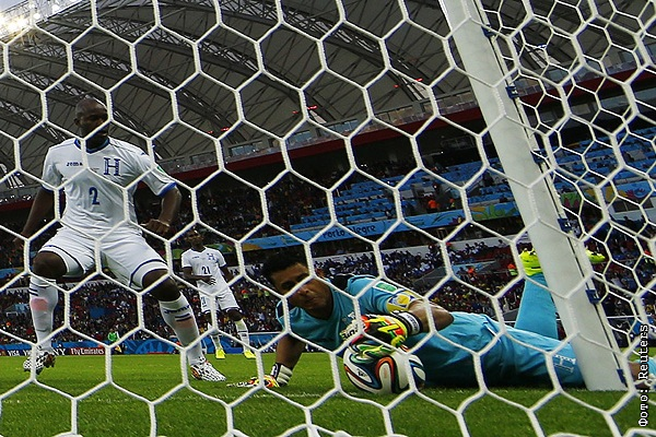 Мяч влетает в ворота сборной Гондураса от рук вратаря Ноэля Вальядареса. В матче Франция - Гондурас впервые на ЧМ-2014 для определения взятия ворот была использована электронная система фиксации гола.