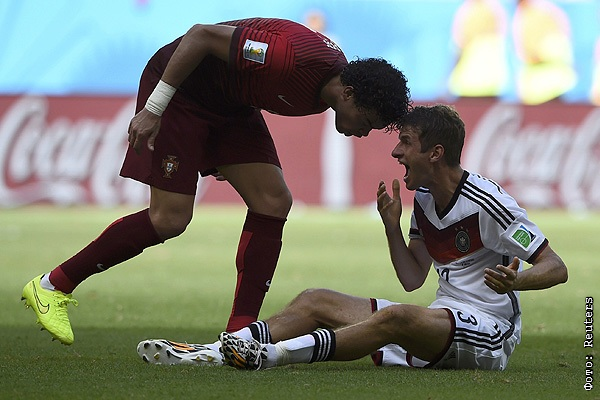 Футболист сборной Португалии Пепе (слева) нарушил правила против полузащитника команды Германии Томаса Мюллера и был удален с поля в матче группы G.