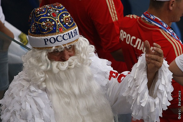 Дед Мороз болеет за сборную России в матче против Южной Кореи.
