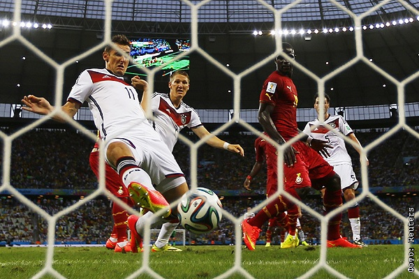 Нападающий сборной Германии Мирослав Клозе забивает свой 15-й гол на чемпионатах мира по футболу. По этому показателю он догнал бразильца Роналдо.