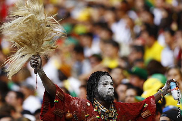 Болельщик сборной Ганы по футболу поддерживает свою команду на матче чемпионата мира против Германии.