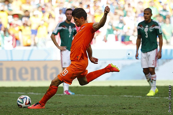 Нападающий сборной Голландии Клас-Ян Хунтелар исполняет пенальти на четвертой добавленной минуте матча 1/8 финала против Мексики. Команда Нидерландов победила со счетом 2:1 и вышла в четвертьфинал.