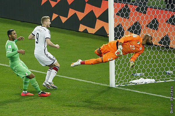 Нападающий сборной Германии Андре Шюррле (№9) забивает гол в ворота команды Алжира в матче 1/8 финала чемпионата мира по футболу.