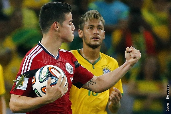 Нападающий сборной Колумбии Джеймс Родригес с помощью кузнечика забил гол в ворота Бразилии.