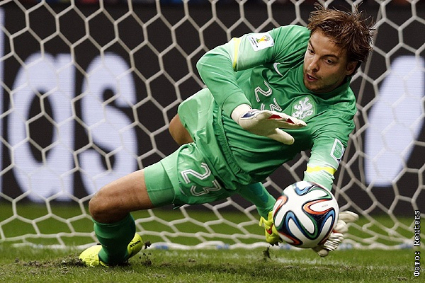 Вратарь сборной Голландии Тим Круг отражает послематчевый пенальти.