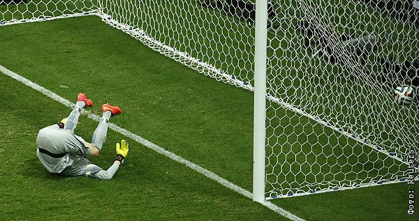 Вратарь сборной Бразилии Жулио Сезар пропускает десятый гол за последнюю неделю: голландец Жоржиньо Вейналдум забивает третий гол своей команды в матче за бронзу чемпионата мира.