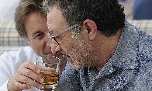 Участник группы "Машина времени" Евгений Маргулис и актер Леонид Ярмольник (справа налево) на церемонии вручения первой литературной премии журнала "Русский пионер" в ресторане "Карлсон".