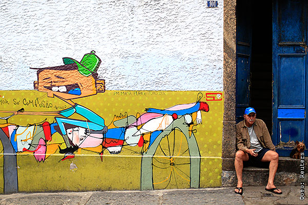 Мужчина с плеером и йоркширским терьером сидит рядом с граффити в районе Санта Тереса в Рио-де-Жанейро. Фотография - часть проекта "На обочине", обобщающего видение ЧМ-2014 зарубежными фотографами.