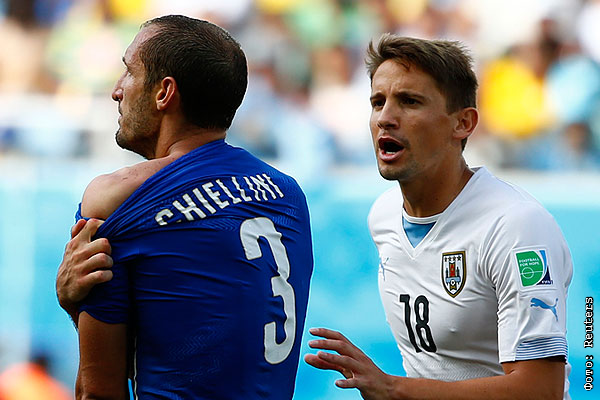 Инцидент произошел ближе к концу матча, завершившегося со счетом 1:0 в пользу Уругвая. Кьеллини в борьбе оттеснил Суареса от мяча, после чего тот укусил его за плечо. Защитник итальянцев показал арбитру след от укуса, однако тот не стал ничего предпринимать в отношении Суареса, что вызвало недовольство итальянской сборной.