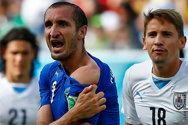 Инцидент произошел ближе к концу матча, завершившегося со счетом 1:0 в пользу Уругвая. Кьеллини в борьбе оттеснил Суареса от мяча, после чего тот укусил его за плечо. Защитник итальянцев показал арбитру след от укуса, однако тот не стал ничего предпринимать в отношении Суареса, что вызвало недовольство итальянской сборной.
