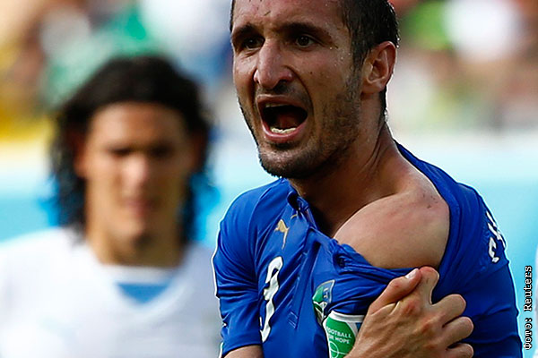 Инцидент произошел ближе к концу матча, завершившегося со счетом 1:0 в пользу Уругвая. Кьеллини в борьбе оттеснил Суареса от мяча, после чего тот укусил его за плечо. Защитник итальянцев показал арбитру след от укуса, однако тот не стал ничего предпринимать в отношении Суареса, что вызвало недовольство итальянской сборной.