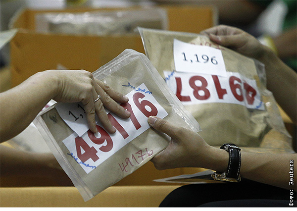 Наркотические вещдоки бережно передают из рук в руки.