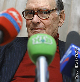 Композитор Эннио Морриконе на пресс-конференци в гостинице "Балчуг-Кемпински"