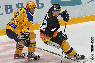 Игрок "Химика" Альберт Лещев и игрок "Северстали" Олег Губин (слева направо) в матче чемпионата России по хоккею: "Химик" (Московская область) – "Северсталь" (Череповец) – 2:3
