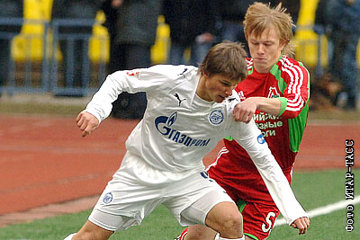 Игрок "Зенита" Андрей Аршавин и железнодорожник Ренат Янбаев (слева направо) в матче Суперкубка России по футболу: "Зенит" (Санкт-Петербург) – "Локомотив" (Москва) – 2:1