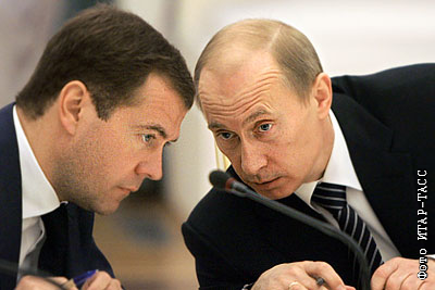 Избранный, но не вступивший в должность президента России Дмитрий Медведев и президент России Владимир Путин на встрече с руководством Госдумы РФ в Кремле