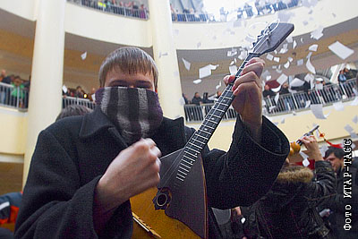 Студенты училища на акции "флэш-моб", проведенной в ТЦ "Атриум" в знак протеста против выселения из общежития