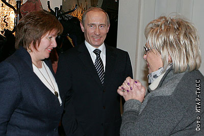 Президент России Владимир Путин с супругой Людмилой и художественный руководитель театра Галина Волчек в театре "Современник" перед премьерой комедии Грибоедова "Горе от ума"