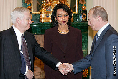 Глава Пентагона Роберт Гейтс, государственный секретарь США Кондолиза Райс и президент России Владимир Путин на встрече в Кремле