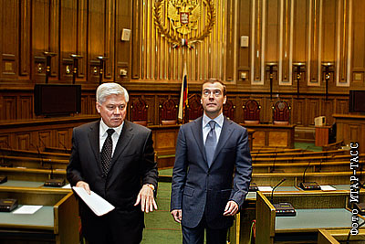 Председатель Верховного суда РФ Вячеслав Лебедев и избранный президент России Дмитрий Медведев после торжественного собрания, посвященного 85-летию создания Верховного суда России