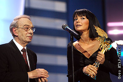 Президент Российской Академии кинематографических искусств "Ника", актер Алексей Баталов и вдова актера Александра Абдулова Юлия, принявшая специальный приз А.Абдулова "За выдающийся вклад в российский кинематограф", на церемонии вручения Национальной кинематографической премии "Ника" в театре Российской армии