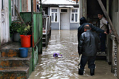 Одна из улиц города, затопленная вышедшей из берегов рекой Риони