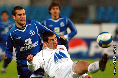 Игроки "Химок" Николай Мияйлович (справа) и "Динамо" Александр Кержаков (слева) в матче чемпионата России по футболу: "Динамо" (Москва) – "Химки" (Московская область) – 2:0