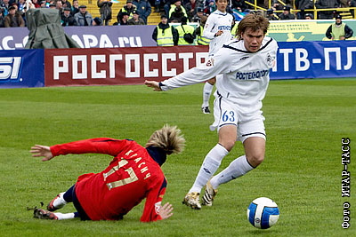 Армеец Милош Красич и игрок команды "Крылья Cоветов" Александр Белозеров (слева направо) в матче чемпионата России по футболу: "Крылья Советов" (Самара) - ЦСКА (Москва) - 0:2