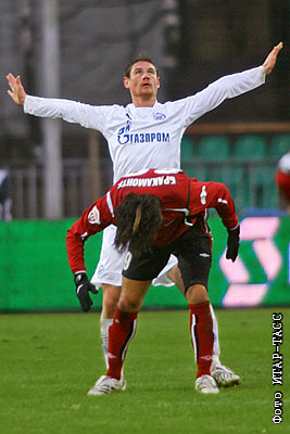 Игроки "Зенита" Константин Зырянов (на втором плане) и "Москвы" Эктор Бракамонте (на первом плане) в матче чемпионата России по футболу: "Москва" (Москва) – "Зенит" (Санкт-Петербург) – 0:2