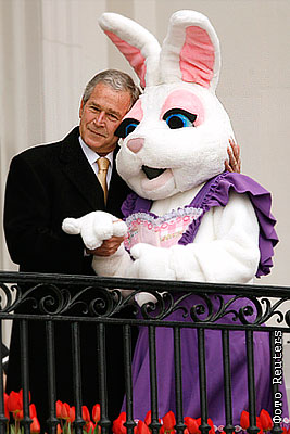 Джордж Буш обнимает Пасхального кролика на крыльце Белого дома