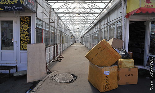 Пустые торговые павильоны вещевого рынка на территории спорткомплекса "Лужники".